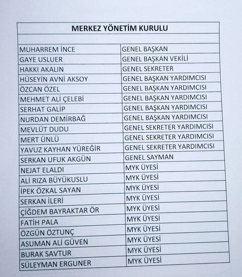 Memleket Partisi MYK listesi