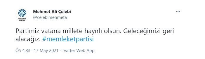 Basın toplantısının ardından sosyal medyadan paylaşım yapan Mehmet Ali Çelebi, ''Partimiz vatana millete hayırlı olsun. Geleceğimizi geri alacağız. #memleketpartisi'' ifadelerini kullandı.