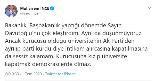 CHP’li Muharrem İnce de üniversitenin kapatılma kararını eleştirerek, Davutoğlu’na destek verdi.