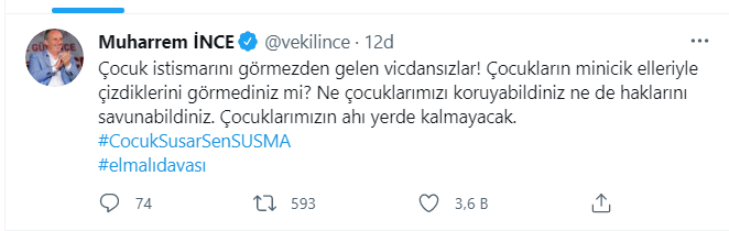 "Çocuk istismarını görmezden gelen vicdansızlar!" diyen İnce, "Çocukların minicik elleriyle çizdiklerini görmediniz mi? Ne çocuklarımızı koruyabildiniz ne de haklarını savunabildiniz. Çocuklarımızın ahı yerde kalmayacak" düşüncesini dile getirdi.
