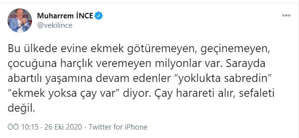 "Bu ülkede evine ekmek götüremeyen, geçinemeyen, çocuğuna harçlık veremeyen milyonlar var. Sarayda abartılı yaşamına devam edenler “yoklukta sabredin” “ekmek yoksa çay var” diyor. Çay harareti alır, sefaleti değil."
