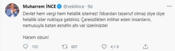 "Devlet hem vergi hem helallik istemez!" diyen İnce, "İtibardan tasarruf olmaz diye diye helallik ister noktaya geldiniz. Çaresizlikten intihar eden insanların, namusuyla batan esnafın ahı var üzerinizde! Haram olsun!" diye yazdı.