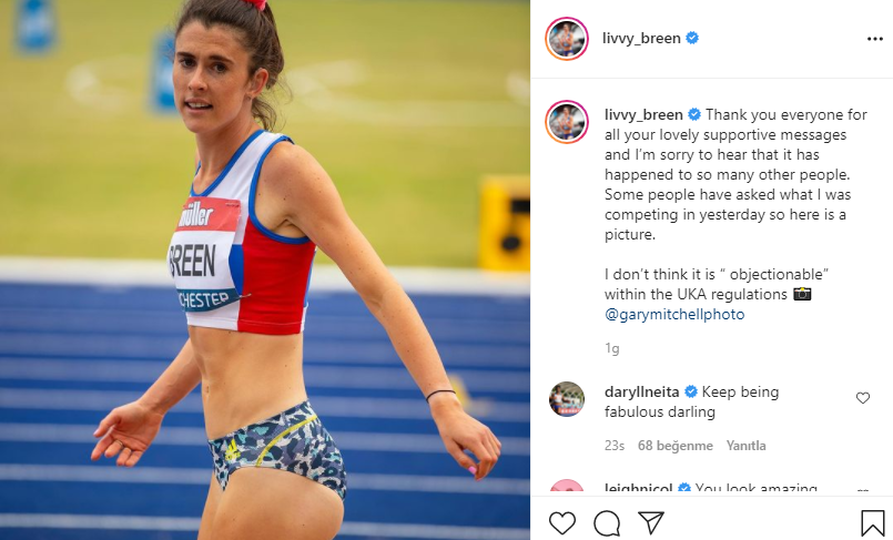 Breen erkek atletlerin benzer eleştirilere maruz kalmadığını ve olayı sosyal medyada paylaştıktan sonra, kadın atletlerin benzer deneyimler yaşadıklarını anlattıklarını belirtti.
