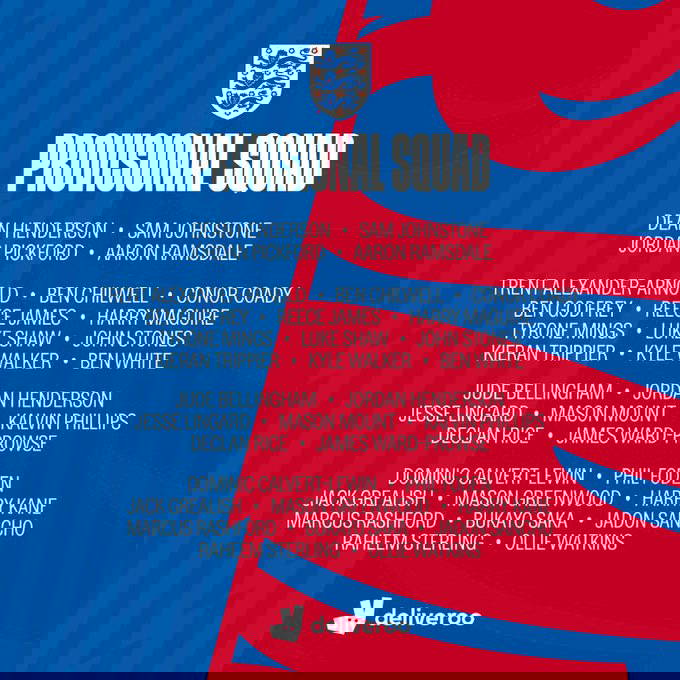 Forvet: Dominic Calvert-Lewin (Everton), Phil Foden (Man City), Jack Grealish (Aston Villa), Mason Greenwood (Manchester United), Harry Kane (Tottenham), Marcus Rashford (Manchester United), Bukayo Saka (Arsenal), Jadon Sancho (Borussia Dortmund), Raheem Sterling (Man City), Ollie Watkins (Aston Villa)