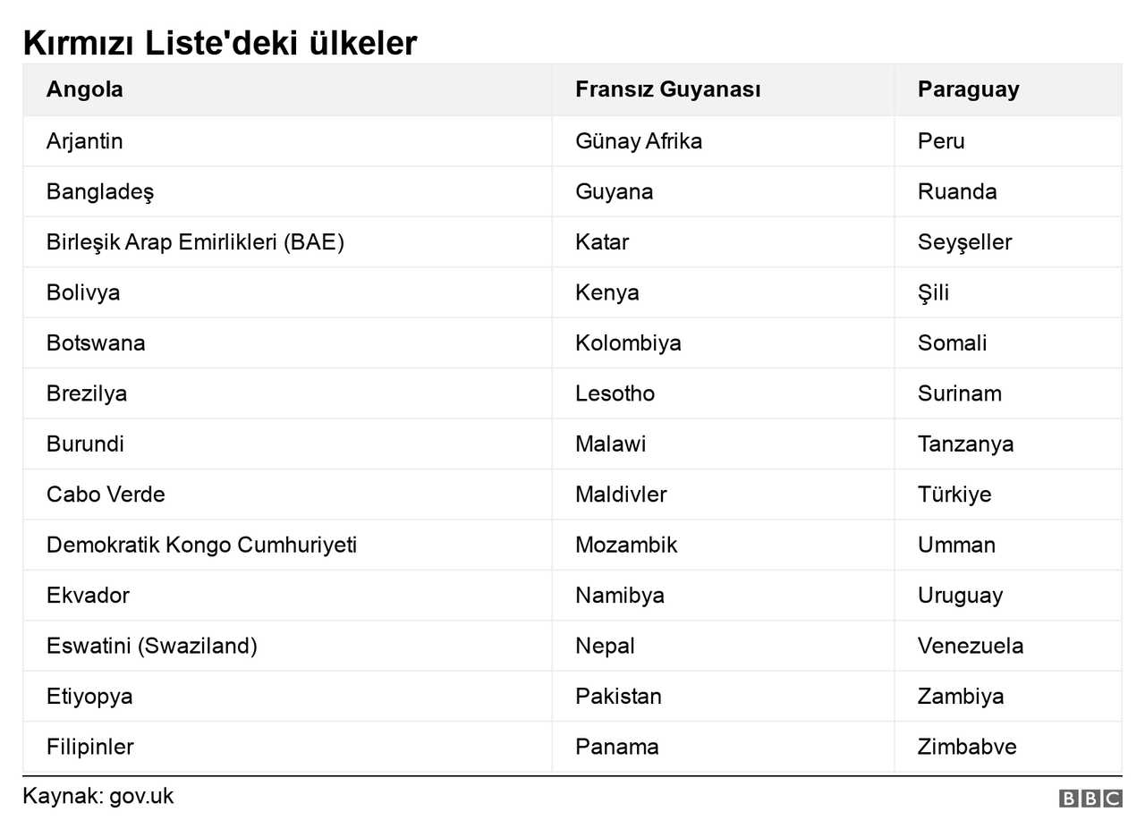 Ulaştırma Bakanı Grant Shapps, 12 Mayıs Çarşamba günü yerel saatle 04:00 itibarıyla Türkiye'nin yanı sıra Nepal ve Maldivler'in de kırmızı listeye ekleneceğini söyledi.