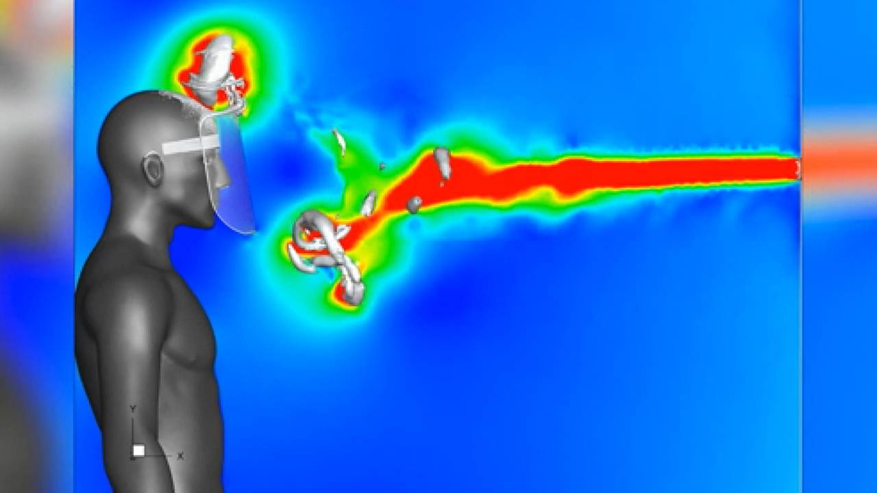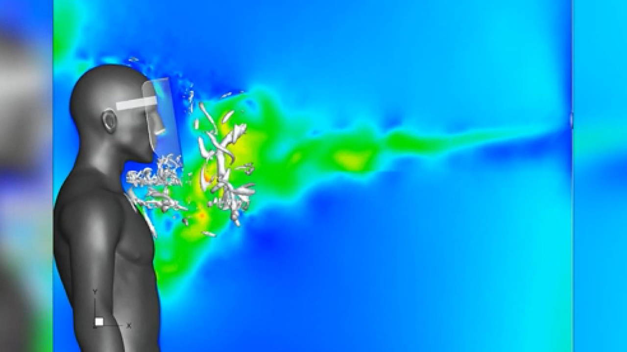 İngiliz araştırmacılar, 1 metre uzaklıkta bulunan birinin hapşırmasıyla damlacıkların yüz siperi takan kişiyi nasıl etkilediğini görselleştirmek için akıllı bilgisayar kullandı.