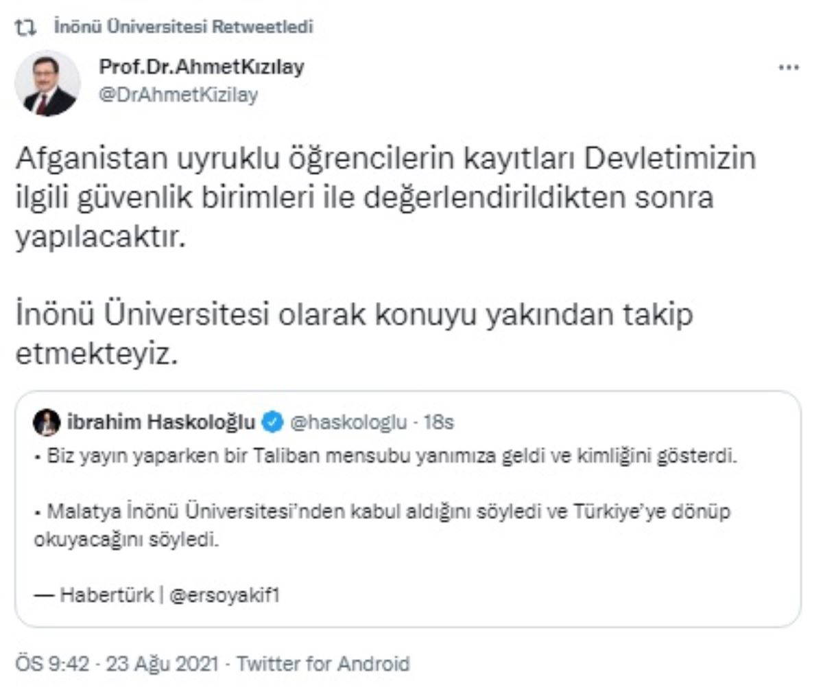 İnönü Üniversitesi Rektörü Prof. Dr. Ahmet Kızılay, sosyal medya hesabından, “Afganistan uyruklu öğrencilerin kayıtları devletimizin ilgili güvenlik birimleri ile değerlendirildikten sonra yapılacaktır. İnönü Üniversitesi olarak konuyu yakından takip etmekteyiz” açıklamasını yaptı.