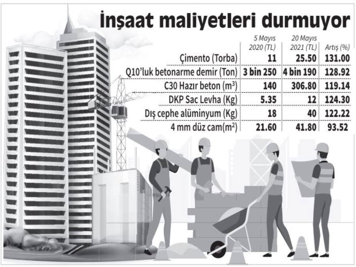 Türkiye İstatistik Kurumu (TÜİK) tarafından açıklanan 2021 Haziran ayına ait inşaat maliyet endeksi, inşaat sektöründeki zamları gözler önüne serdi. 2021 yılı haziran ayında bir önceki aya göre, yüzde 2.89 artan endeks, bir önceki yılın aynı ayına göre ise yüzde 42.48 arttı. Bu artış endeksin yayımlanmaya başlandığı 2015’ten bu yana en yüksek yıllık artış olarak tarihe geçti. İnşaatçılar ise bu rakamların buzdağının görünen yüzü olduğunu, reel sektördeki artışların çok daha fazla olduğunu söylüyor.