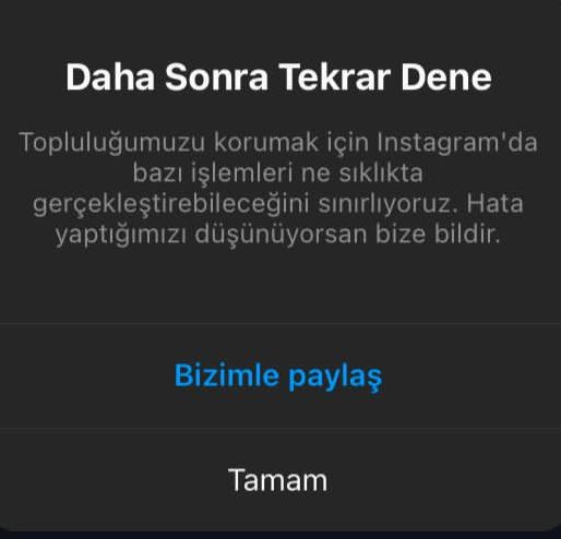 Instagram'a giren kullanıcılar bir hatayla karşılaştı. Kullancılar, Instagram'a girdiğinde "topluluğumuzu korumak için bazı hareketleri kısıtlıyoruz" hatası ile karşılaştı.