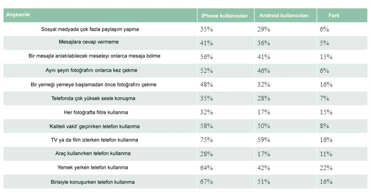 Öte yandan; bir kişiyle konuşurken telefon kullanma, sosyal medya paylaşımı yapma ve fotoğrafta filtre kullanma, yemek yerken telefonla ilgilenme, görüşme sırasında yüksek sesle konuşma, mesajlara cevap vermeme ve yemek fotoğrafları çekme konusunda da iPhone sahipleri daha kötü durumda