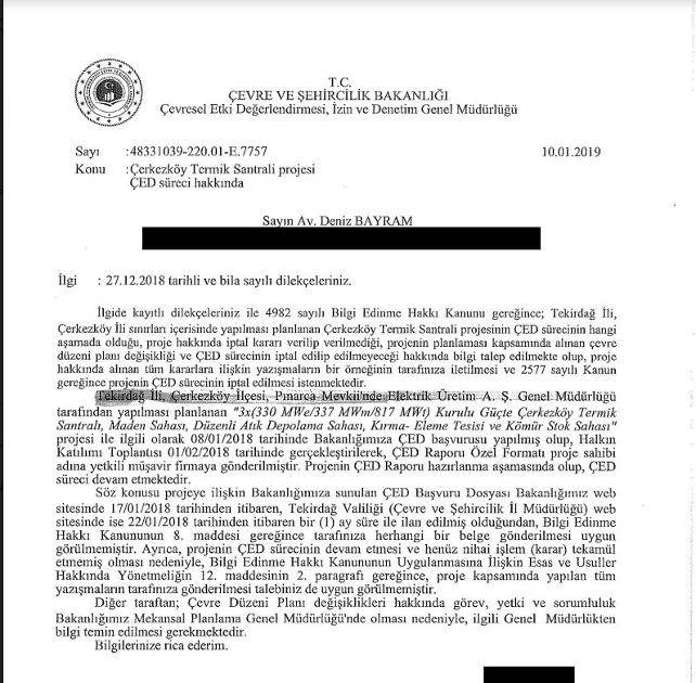 Yine aynı kapsamda Elektrik Üretim A.Ş.’ye (EÜAŞ) yapılan bilgi edinme başvurusuna gelen yanıtta ise “Trakya Bölgesi’ndeki kömür kaynaklarının değerlendirilmesine yönelik proje geliştirme süreçleri devam etmektedir. Bahsi geçen konular Bakanlığın takdirindedir” dendi.