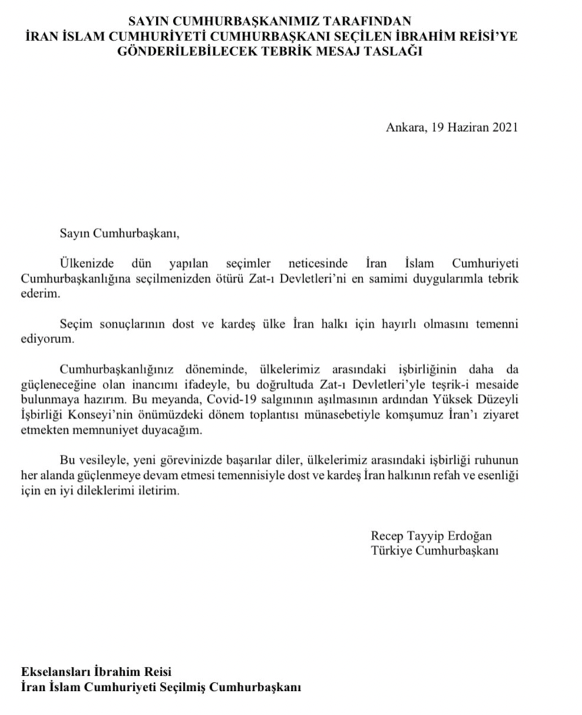 İran Ankara Büyükelçiliği resmi Twitter hesabından ise Cumhurbaşkanı Recep Tayyip Erdoğan’ın imzasının bulunduğu bir metin paylaşıldı. Metinde İbrahim Reisi’ye seçimde galibiyetinden dolayı tebrik mesajı yer aldı. Ancak tebrik metinin başlığında “Sayın Cumhurbaşkanımız tarafından İran İslam Cumhuriyeti Cumhurbaşkanı Seçilen İbrahim Reisi’ye Gönderilebilcek Tebrik Mesajı Taslağı” yazdığı görüldü.