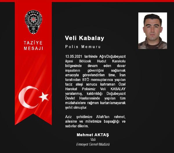 "13 Mayıs 2021 tarihinde Ağrı/Doğubeyazıt ilçesi Bölücek Hudut Karakolu bölgesinde devam eden duvar inşaatının güvenliğini sağlamak amacıyla gönderilen time, İran tarafından bölücü terör örgütü mensuplarınca yapılan taciz ateşi sonucu kahraman Özel Harekat polisimiz Veli Kabalay yaralanmış, kaldırıldığı Doğubeyazıt Devlet Hastanesi'nde yapılan tüm müdahalelere rağmen kurtarılamayarak şehit olmuştur. Aziz şehidimize Allah'tan rahmet, ailesine ve milletimize başsağlığı ve sabırlar dilerim."
