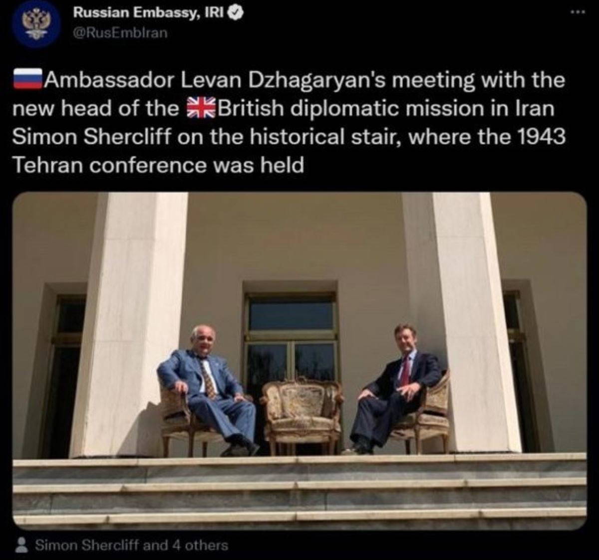 Rusya’nın İran Büyükelçiliğine ait sosyal medya hesabından, “Büyükelçi Levan Dzhagaryan, İngiltere’nin yeni İran Büyükelçisi Simon Shercliff ile 1943 Tahran konferansının yapıldığı tarihi merdivenlerde” ifadelerini kullanılarak, Rusya Büyükelçisi Dzhagaryan ile İngiltere’nin yeni İran Büyükelçisi Shercliff’in 1943 Tahran konferansının yapıldığı binanın merdivenlerinde fotoğrafı paylaşıldı.