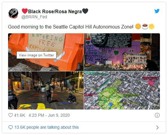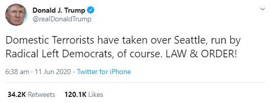Trump, Twitter paylaşımlarında şu ifadeleri kullandı: “Radikal solcu demokratlar tarafından yönetilen Seattle, yerel teröristlerin eline geçti. KANUN & DÜZEN”, "Şehrinizi geri alın. Almazsanız, ben alırım. Bu bir oyun değil. Bu çirkin anarşistler acilen durdurulmalı. Hızlı hareket edin”
