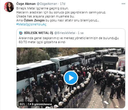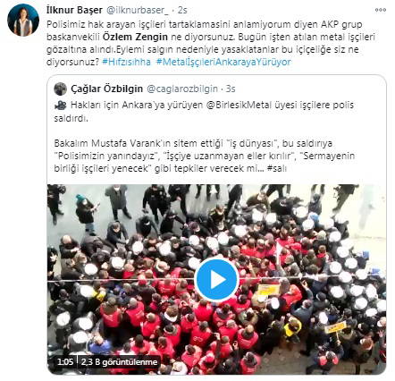 SOL Parti Başkanlar Kurulu Üyesi İlknur Başer, "Polisimiz hak arayan işçileri tartaklamasini anlamiyorum diyen AKP grup baskanvekili Özlem Zengin ne diyorsunuz. Bugün işten atılan metal işçileri gözaltına alındı.Eylemi salgın nedeniyle yasaklatanlar bu içiçeliğe siz ne diyorsunuz?" ifadelerini kullandı.