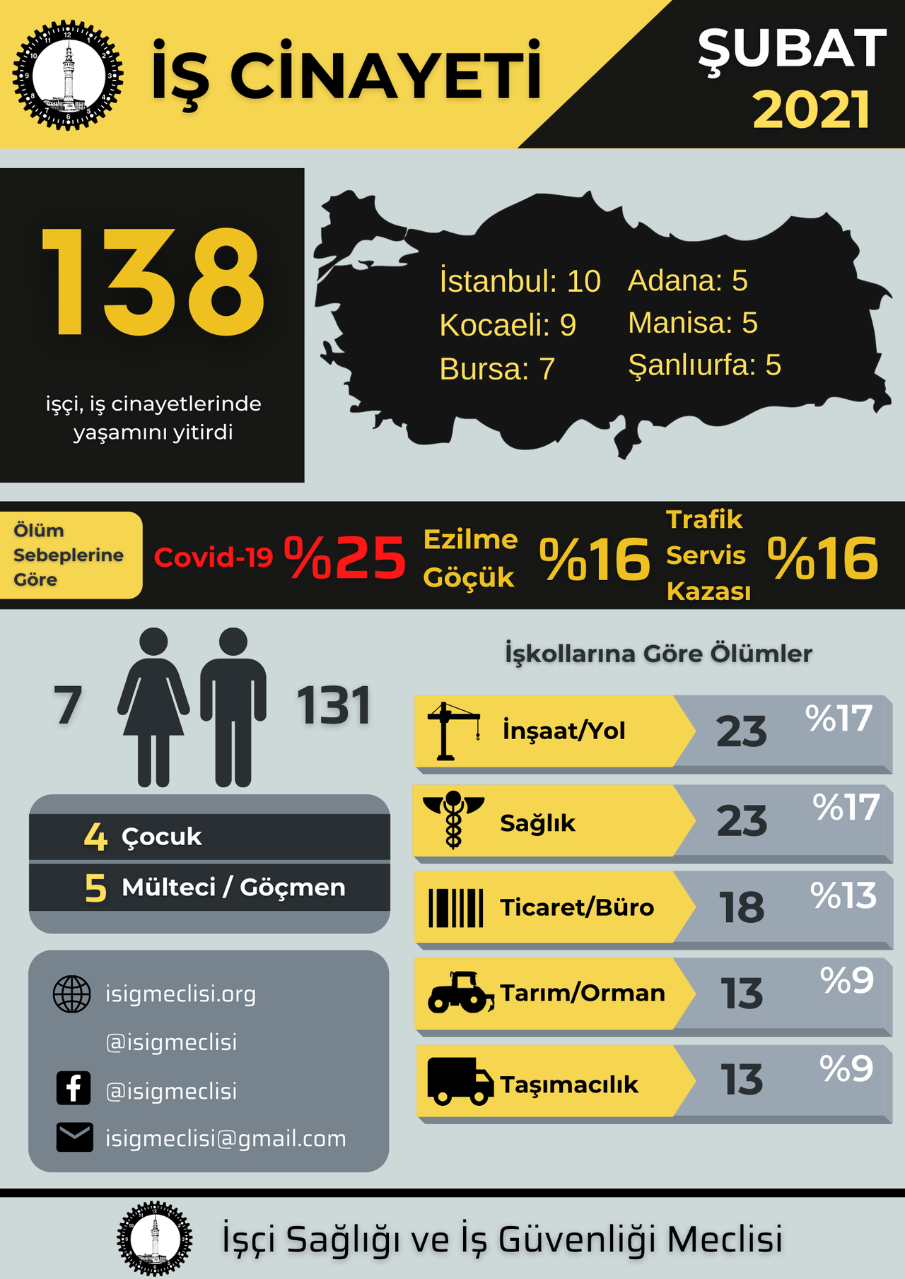 İSİG Meclisi’nin “Salgın Yönetimine Karşı Direniş ve Dayanışma Kazanacak” başlıklı raporunda yüzde 75’ini ulusal basından, yüzde 25’ini ise yerel basın, işçilerin mesai arkadaşları, aileleri, iş güvenliği uzmanları, işyeri hekimleri, meslek örgütleri ve sendikalardan öğrendiğimiz bilgilere dayanarak tespit ettiğimiz kadarıyla Şubat ayında en az 138 işçi iş cinayetlerinde yaşamını yitirdi.