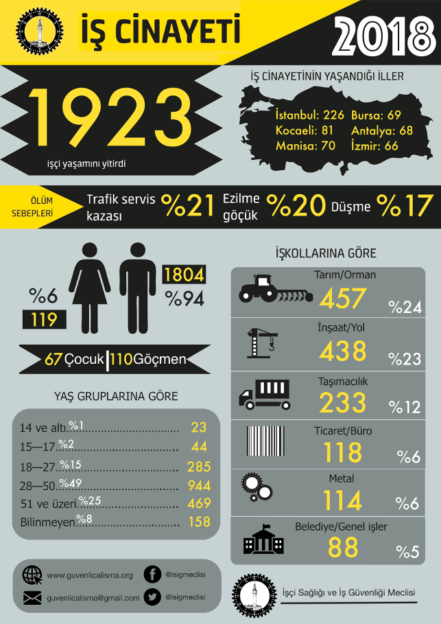 Rapora göre; 2018 yılında Türkiye’nin 81 ilinde 119’u kadın, 1804’ü erkek olmak üzere 1923 işçi yaşamını yitirdi. 14 yaş ve altı 23, 15-17 yaş arası 44 olmak üzere 67 çocuk işçi yaşamını yitirdi.