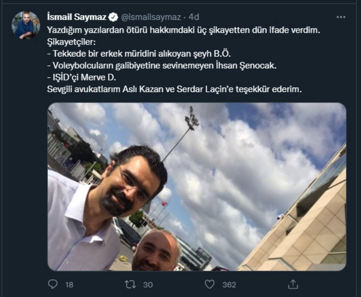 İsmail Saymaz, ifade verdiğini duyurdu. Avukatı ile birlikte fotoğrafını paylaşan Saymaz, "Tekkede bir erkek müridini alıkoyan şeyh B.Ö., Voleybolcuların galibiyetine sevinemeyen İhsan Şenocak ve IŞİD’çi Merve D." başlıklı yazıları nedeniyle ifade verdiğini belirtti.
