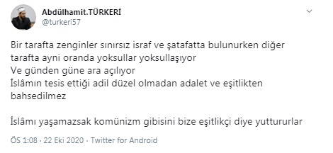 Bir tarafta zenginlerin sınırsız israf ve şatafatta bulunduğunu diğer tarafta ise yoksulların aynı oranda yoksullaştığını belirten Türkeri, bu aranın da günden güne açıldığına işaret edip "İslâmın tesis ettiği adil düzel olmadan adalet ve eşitlikten bahsedilmez" dedi.