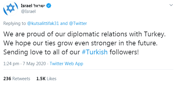 7 Mayıs'ta, İsrail devleti resmi Twitter hesabından paylaşılan bir iletide, "Türkiye ile diplomatik ilişkilerimizle gurur duyuyoruz. Bağlarımızın gelecekte daha da güçlenmesini umuyoruz. Bütün Türk takipçilerimize sevgilerimizi gönderiyoruz” mesajı yer aldı.