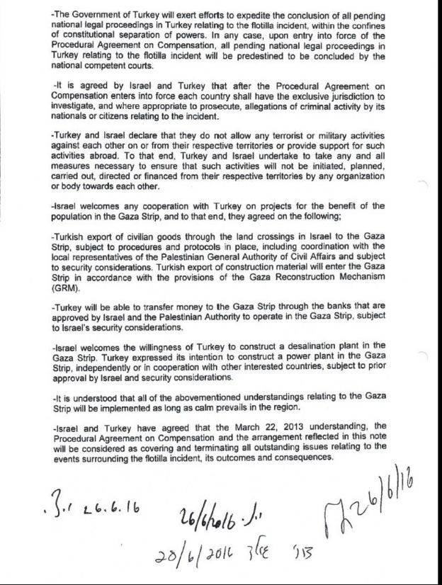 28 Haziran 2016'da imzalanan ve ardından büyükelçilerin karşılıklı atandığı anlaşmanın kamuoyuna açıklanan 6 maddesinde, sadece tazminata yönelik hükümler yer aldı.