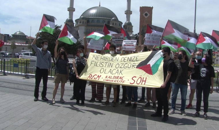 Taksim Meydanı'nda "Nehirden denize Filistin özgür olacak" yazılı pankart açıp Filistin bayrakları taşıyan grup sloganlar atıp İsrail'i protesto etti.