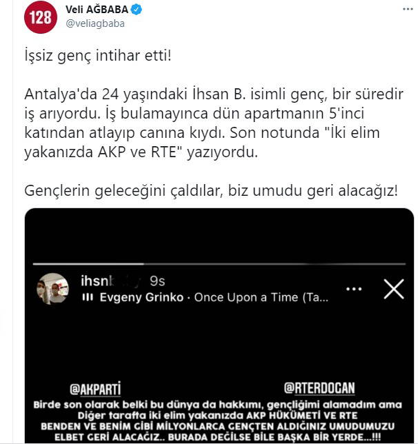 Gencin veda mesajını sosyal medya hesabından paylaşan CHP Genel Başkan Yardımcısı Veli Ağbaba, "İşsiz genç intihar etti! Antalya'da 24 yaşındaki İhsan B. isimli genç, bir süredir iş arıyordu. İş bulamayınca dün apartmanın 5'inci katından atlayıp canına kıydı. Son notunda 'İki elim yakanızda AKP ve RTE' yazıyordu. Gençlerin geleceğini çaldılar, biz umudu geri alacağız!" ifadelerini kullandı.