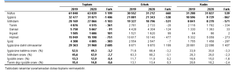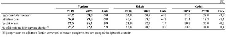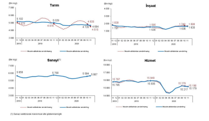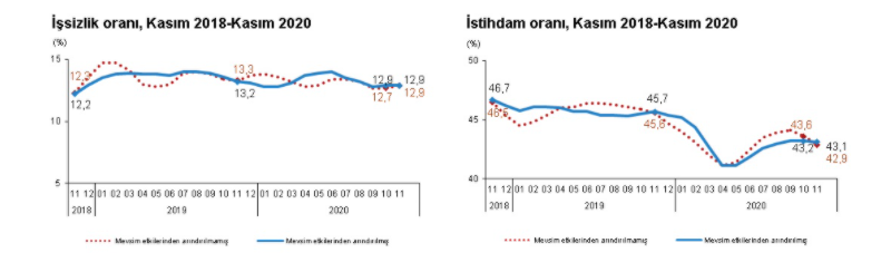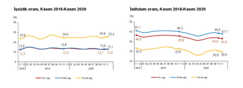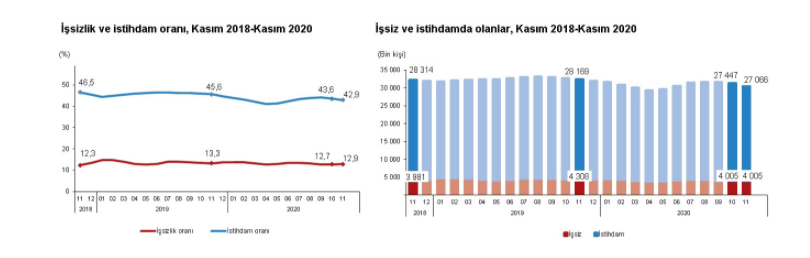Türkiye genelinde 15 ve daha yukarı yaştakilerde işsiz sayısı 2020 yılı Kasım döneminde geçen yılın aynı dönemine göre 303 bin kişi azalarak 4 milyon 5 bin kişi oldu. İşsizlik oranı 0,4 puanlık azalış ile %12,9 seviyesinde gerçekleşti. Tarım dışı işsizlik oranı 0,6 puanlık azalış ile %14,8 oldu.