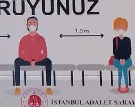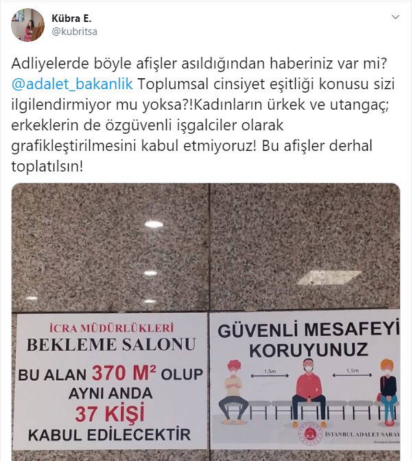 Feminist Avukat Kübra Ekmen, İstanbul Adalet Sarayı'na sosyal mesafenin korunması için asılan afişlerin cinsiyetçi olması nedeniyle tepki gösterdi. Asılan afişlerde, erkek bireylerin bacaklarını yayarak oturması, kadın bireylerin ise ürkek ve utangaç bir şekilde simgelenmesi tepkilere neden oldu.