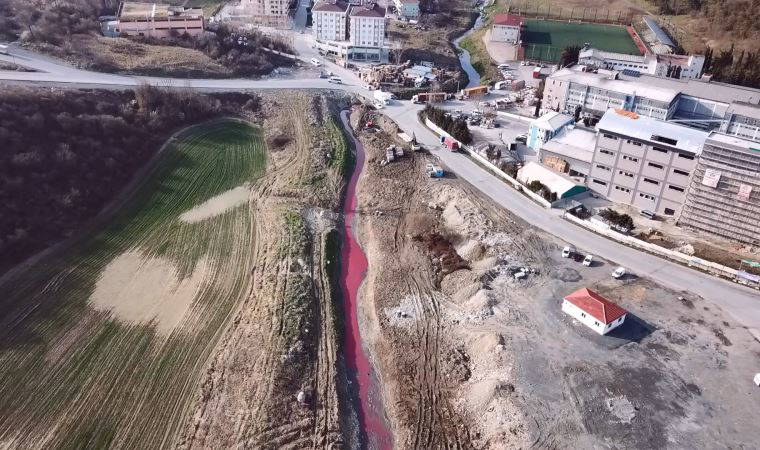Renginin kırmızıya döndüğü Hadımköy'deki dere, havadan da fotoğraflandı.