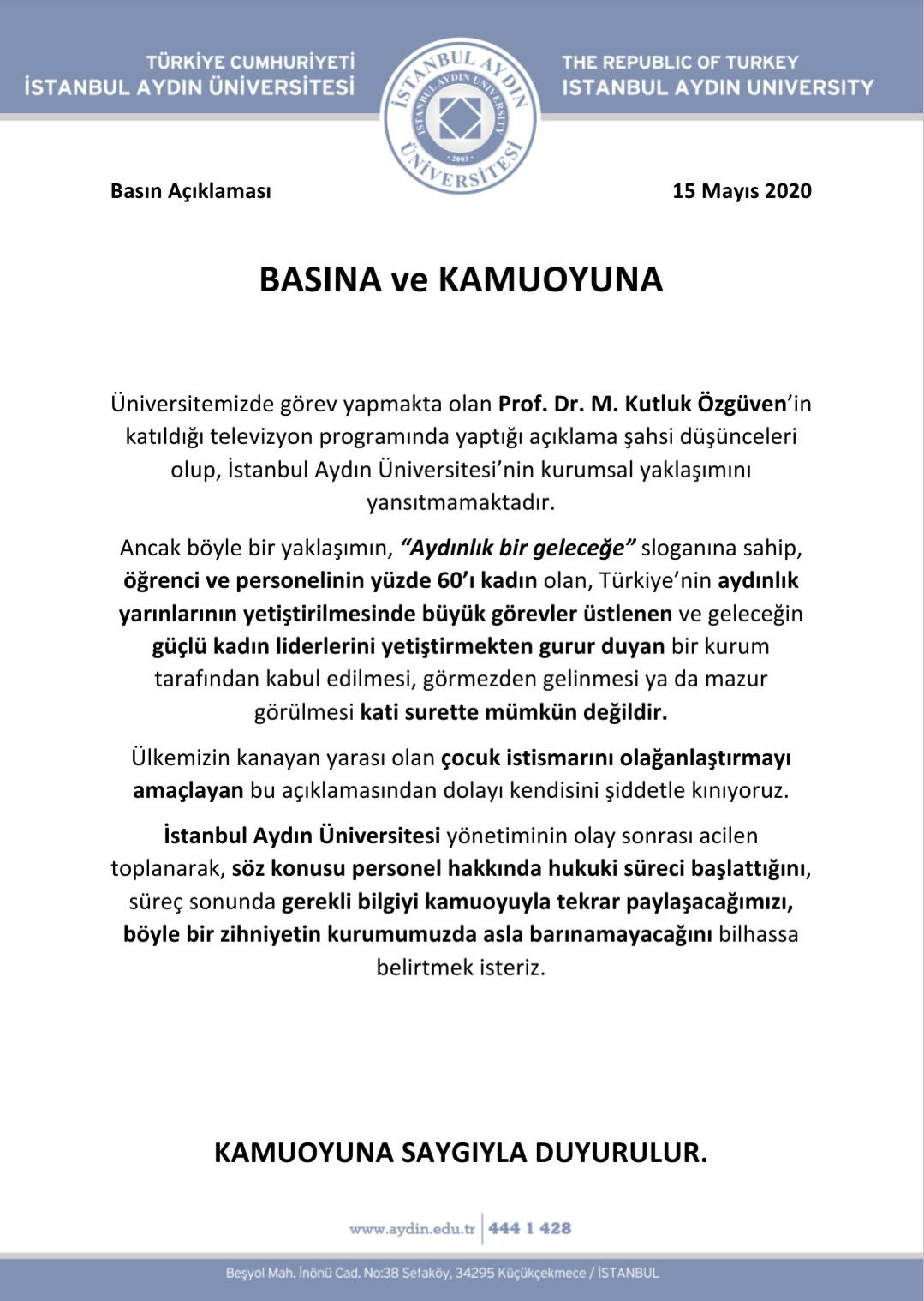 Prof. Dr. Muttalip Kutluk Özgüven'nin canlı yayındaki skandal sözlerinin ardından çalıştığı üniversite olan Aydın Üniversitesinden bir açıklama yapıldı. Açıklamada Prof. Dr. Muttalip Kutluk Özgüven'nin kınandığı ve Özgüven hakkında hukuki süreç başlatıldığını açıklandı.