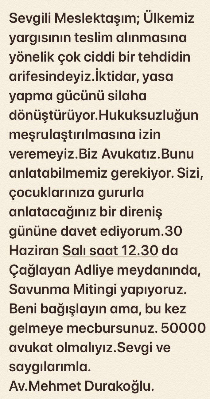 Durakoğlu sosyal medya hesabından yayınladığı mesajında, "GELMEYE MECBURSUNUZ! “Savunma Mitingi” 30 Haziran 2020 Çağlayan Adliyesi karşısındaki meydan. Saat 12.30" dedi.