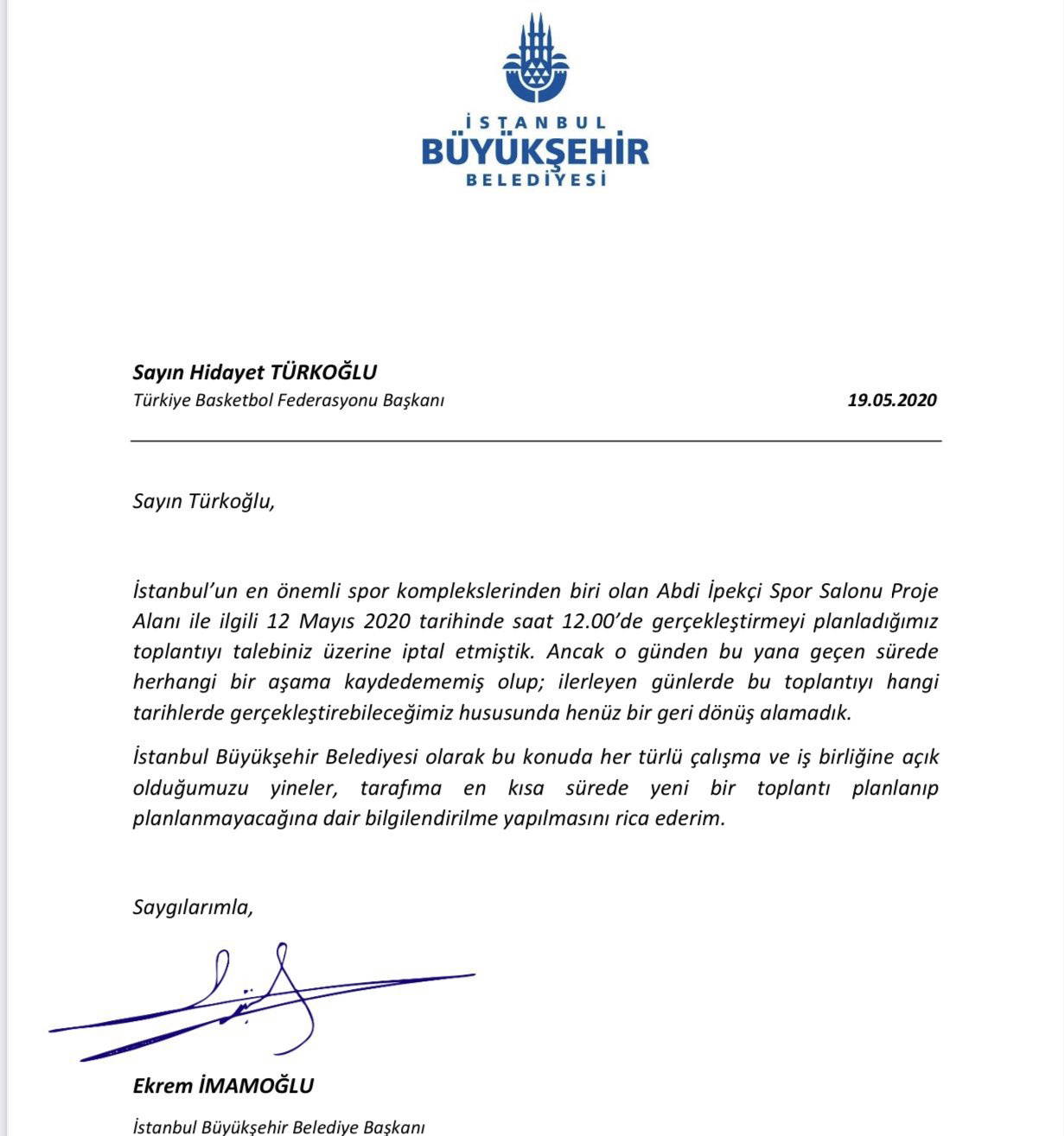 İstanbul Büyükşehir Belediye Başkanı Ekrem İmamoğlu, AKP Genel Başkanı ve Cumhurbaşkanı Recep Tayyip Erdoğan'ın başdanışmanlığını da yapan Türkiye Basketbol Federasyonu Başkanı Hidayet Türkoğlu'na gönderdiği yazıda şunları belirtti: