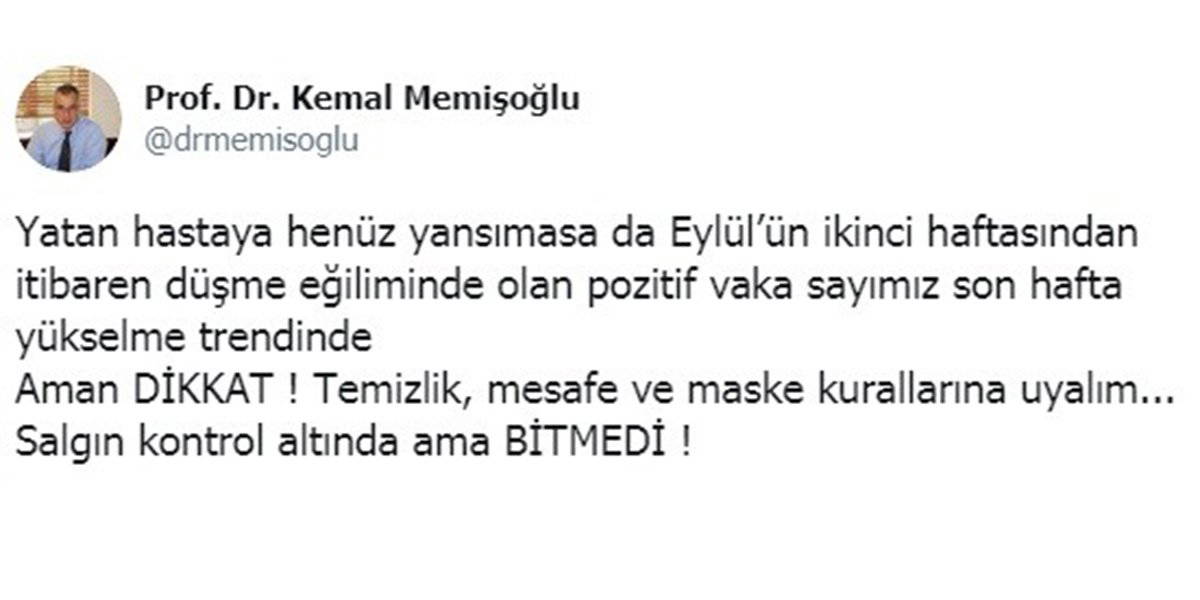 Resmi sosyal medya hesabından açıklamalarda bulunan Memişoğlu, Eylül'ün ikinci haftasından itibaren düşme eğiliminde olan pozitif vaka sayısının son hafta yükselme trendinde olduğunu belirtti.
