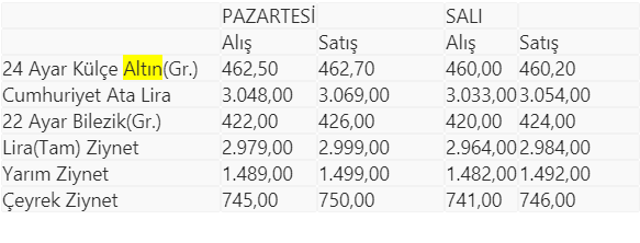 İstanbul Kapalıçarşı'da alınıp satılan altın türlerinin, önceki kapanış ve bugün açılış fiyatları (TL) şöyle: