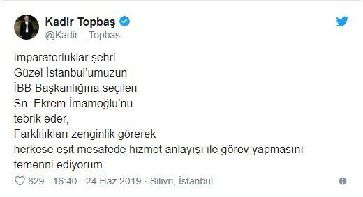 Topbaş paylaşımında, "Sn. Ekrem İmamoğlu'nu tebrik eder, farklılıkları zengin görerek herkese eşit mesafede hizmet anlayışı ile görev yapmasını temenni ediyorum" dedi.