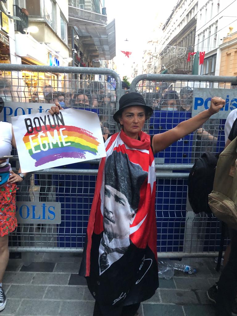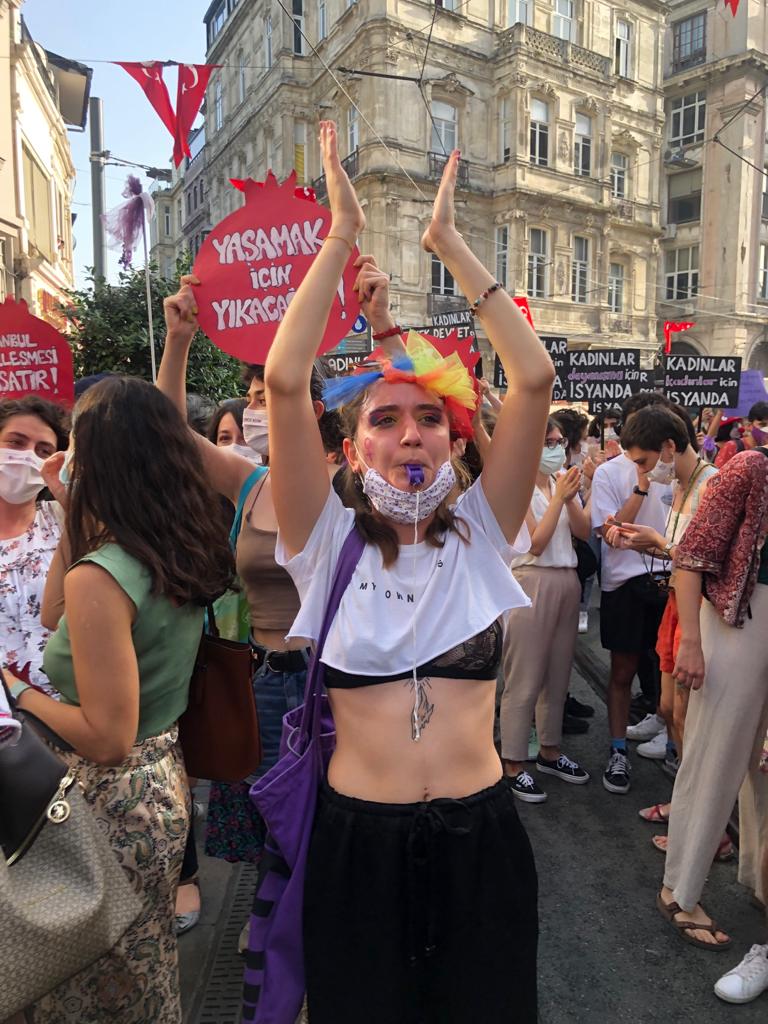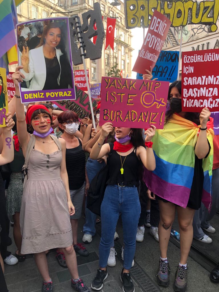 “İstanbul Sözleşmesi’nden vazgeçmiyoruz bizim için bitmedi” yazılı pankartın önünde grup adına yapılan açıklamada, “Haklarımızı bu sokaklarda kazandık. Bizim için bitmedi. Yeniden haklarımızı geri kazanacağız. Sözleşmeyi yeniden kazanacağız. O sözleşmeyi uygulatmadan mücadeleden vazgeçmeyeceğiz. İstanbul Sözleşmesi’nden çekilme kararı yok hükmündedir. Bugün devlet İstanbul Sözleşmesi’den çekilerek ‘kadınları dövebilirsiniz’ dedi. İstismarcıları serbest bırakıyorlar. Ancak gökkuşağını yasaklıyor. LGBTİ haklarından vazgeçmiyoruz. Bugünkü açılan eylem planı tamamen yalan. İnanmıyoruz size. Eşitlik olmadan adalet olmaz” denildi.