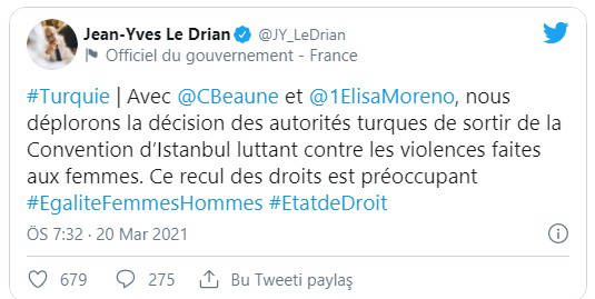 Le Drian, sosyal medya hesabından İstanbul Sözleşmesi'nin feshine ilişkin açıklama yaptı. Le Drian'ın Avrupa İşlerinden Sorumlu Devlet Bakanı Clement Beaune ve Cinsiyet Eşitliği Bakanı Elisabeth Moreno'yu da etiketlediği paylaşımı şöyle: