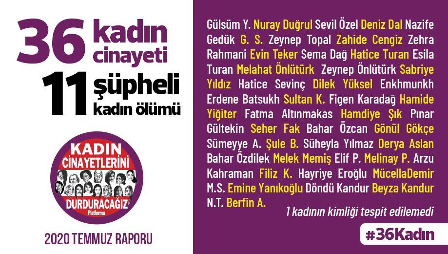 Kadına yönelik şiddeti önleme amacı taşıyan, Türkiye'nin de imzacısı oludğu uluslararası bir sözleşme olan İstanbul Sözleşmesi'nin kaldırılmasına yönelik baskılar sürerken, Kadın Cinayetlerini Durduracağız Platformu'nun açıkladığı rapora göre, temmuz ayında 36 kadın cinayeti işlendi, 11 kadın şüpheli bir şekilde ölü bulundu.