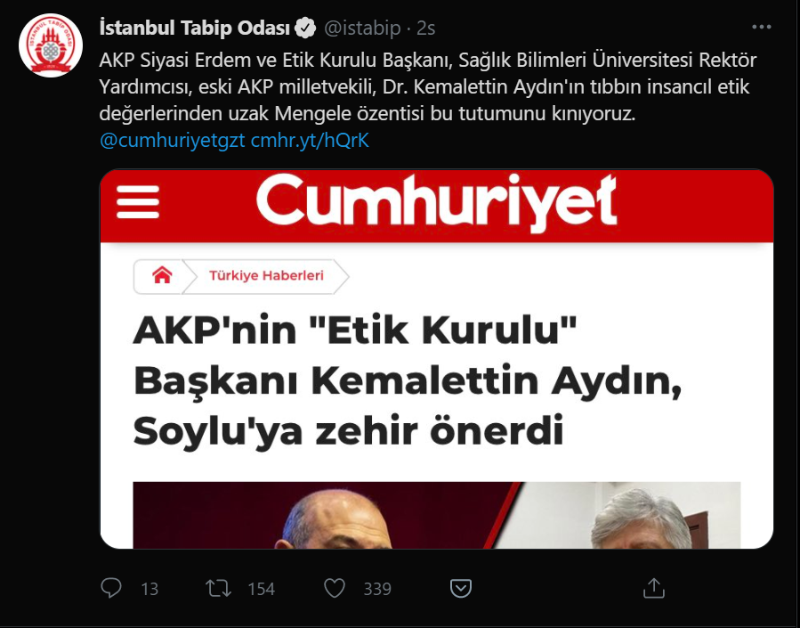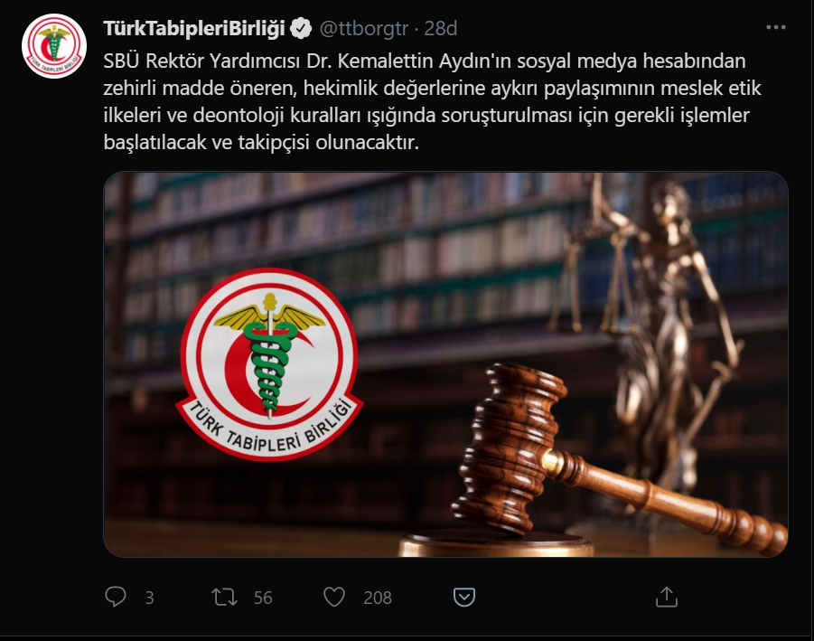 "SBÜ Rektör Yardımcısı Dr. Kemalettin Aydın'ın sosyal medya hesabından zehirli madde öneren, hekimlik değerlerine aykırı paylaşımının meslek etik ilkeleri ve deontoloji kuralları ışığında soruşturulması için gerekli işlemler başlatılacak ve takipçisi olunacaktır."