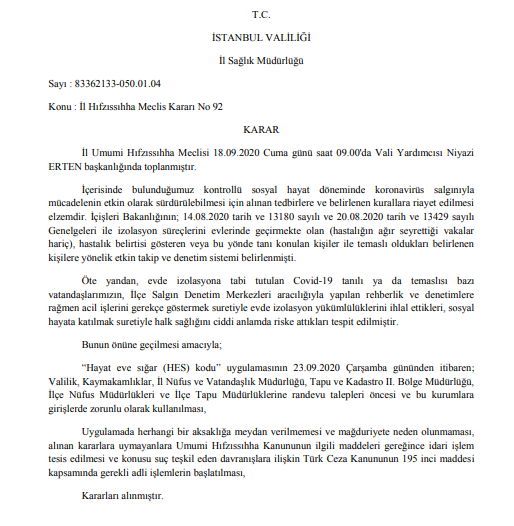 İstanbul Valiliği'nin internet sitesinden yapılan yazılı açıklamada İl Umumi Hıfzıssıhha Meclisi'nin aldığı karara göre 23 Eylül Çarşamba gününden itibaren Hayat Eve Sığar (HES) kodu kullanımı; Valilik, Kaymakamlıklar, İl Nüfus ve Vatandaşlık Müdürlüğü, Tapu ve Kadastro II. Bölge Müdürlüğü, İlçe Nüfus Müdürlükleri ve İlçe Tapu Müdürlükleri’ne randevu talepleri öncesi ve bu kurumlara girişlerde zorunlu hale getirildi.