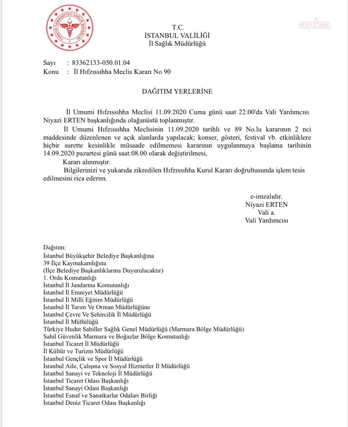 İstanbul Valiliği İl Hıfzıssıhha Meclisi, 'açık alanlarda yapılacak konser, gösteri, festival gibi etkinliklerin yasaklanması" kararını 4 saat sonra değiştirdi. Saat 18.00'de yapılan toplantıda, bu gece yarısından itibaren yasak kararı alınırken, 4 saat sonra, gece 22.00'de toplanan Kurul, yasağı pazartesi sabahına kadar erteledi. Kararla hafta sonunda, deniz araçlarında ve açık havada düğün, nikah, sünnet düğünü, kına gecesi, nişan ile açık hava konserleri, festivaller gibi etkinlikler serbest bırakıldı.