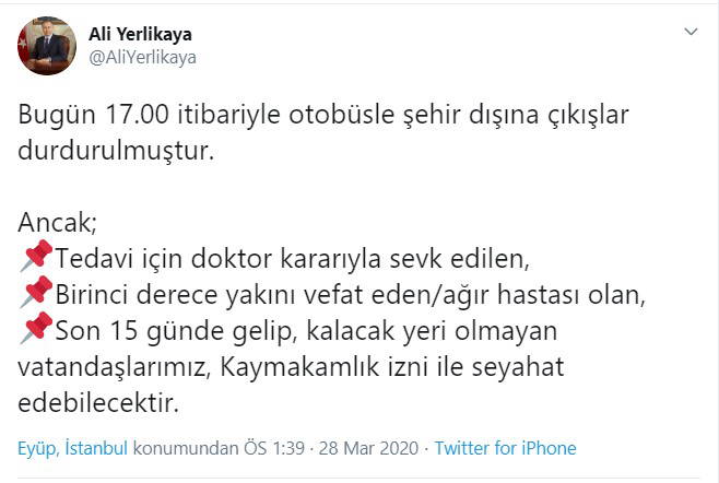 Twitter hesabından açıklamada bulunan Yerlikaya, bugün saat 17.00 itibariyle otobüsle şehir dışına çıkışların durdurulduğunu belirtti. Yerlikaya, Kaymakamlık izni ile seyahat edebileceklerin kriterlerini ise şöyle sıraladı: