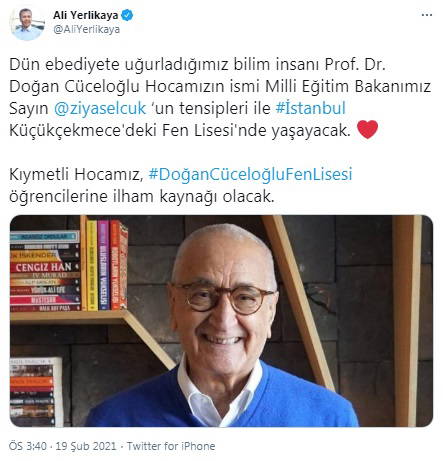 "Dün ebediyete uğurladığımız bilim insanı Prof. Dr. Doğan Cüceloğlu Hocamızın ismi Milli Eğitim Bakanımız Sayın Ziya Selçuk'un tensipleri ile İstanbul Küçükçekmece'deki Fen Lisesi'nde yaşayacak. Kıymetli Hocamız, Doğan Cüceloğlu Fen Lisesi öğrencilerine ilham kaynağı olacak."