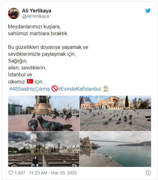 Vali Yerlikaya, Twitter hesabından yaptığı paylaşımda şu ifadelere yer verdi: “Meydanlarımızı kuşlara, sahilimizi martılara bıraktık. Bu güzellikleri doyasıya yaşamak ve sevdiklerimizle paylaşmak için, sağlığın, ailen, sevdiklerin, İstanbul ve ülkemiz için ‘48 saat hiç çıkma‘, ‘ Evinde kal İstanbul.”