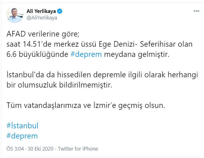 “AFAD verilerine göre; saat 14.51'de merkez üssü Ege Denizi- Seferihisar olan 6.6 büyüklüğünde #deprem meydana gelmiştir. İstanbul'da da hissedilen depremle ilgili olarak herhangi bir olumsuzluk bildirilmemiştir.”
