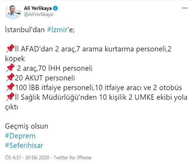 Yerlikaya, yaptığı ikinci açıklamada İstanbul'dan İzmir'e ekiplerin yola çıktığını duyurdu. Yerlikaya'nın paylaşımı şu şekilde: