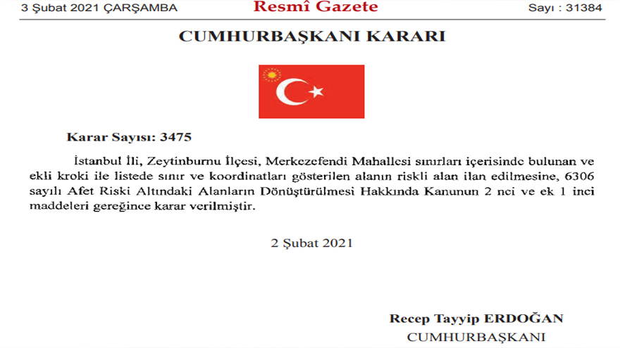 3 Şubat 2021 tarihli Resmi Gazete ile yayımlanan İstanbul İli, Zeytinburnu İlçesi, Merkezefendi Mahallesi Sınırları İçerisinde Bulunan Alanın Riskli Alan İlan Edilmesi Hakkında Karar (Karar Sayısı:?3475) Cumhurbaşkanı Recep Tayyip Erdoğan tarafından imzalandı ve bugün itibari ile yürürlüğe girdi.
