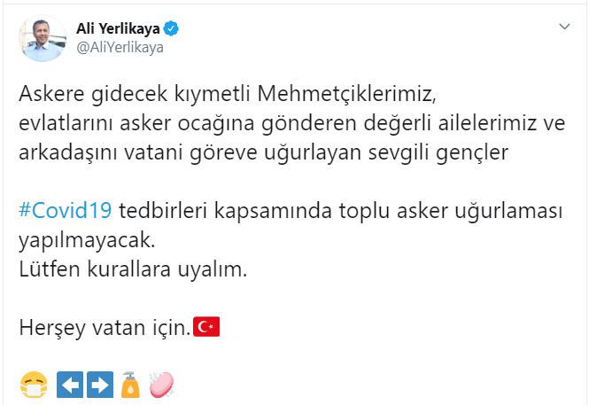 "Askere gidecek kıymetli Mehmetçiklerimiz, evlatlarını asker ocağına gönderen değerli ailelerimiz ve arkadaşını vatani göreve uğurlayan sevgili gençler Covid-19 tedbirleri kapsamında toplu asker uğurlaması yapılmayacak. Lütfen kurallara uyalım. Her şey vatan için"